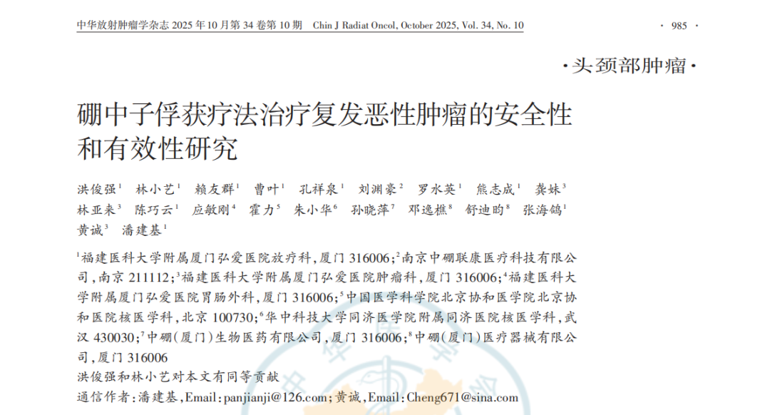 近日,厦门弘爱医院与中硼医疗联合开展的加速器BNCT(AB-BNCT)治疗复发恶性肿瘤的安全性和有效性研究,正式发表于《中华放射肿瘤学杂志》。这是国内首次报道AB-BNCT在复发难治性恶性肿瘤中的前瞻性研究,也是双方继间叶性软骨肉瘤(MCS)研究成果发表后的又一重大突破!